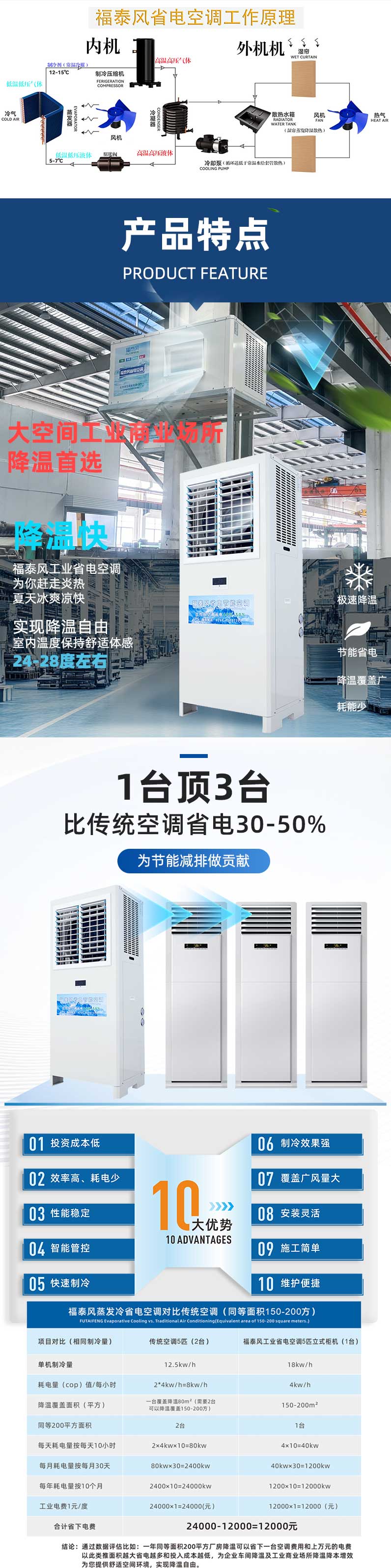 與傳統(tǒng)空調(diào)相比,蒸發(fā)冷省電空調(diào)在耗電量上具有明顯優(yōu)勢(shì)。福泰5匹的空調(diào),傳統(tǒng)空調(diào)一小時(shí)耗電量約為5.6度電,而蒸發(fā)冷省電空調(diào)一小時(shí)耗電量?jī)H為4.2度電左右。這意味著,在相同的使用條件下,蒸發(fā)冷省電空調(diào)能夠節(jié)省大量的電能。